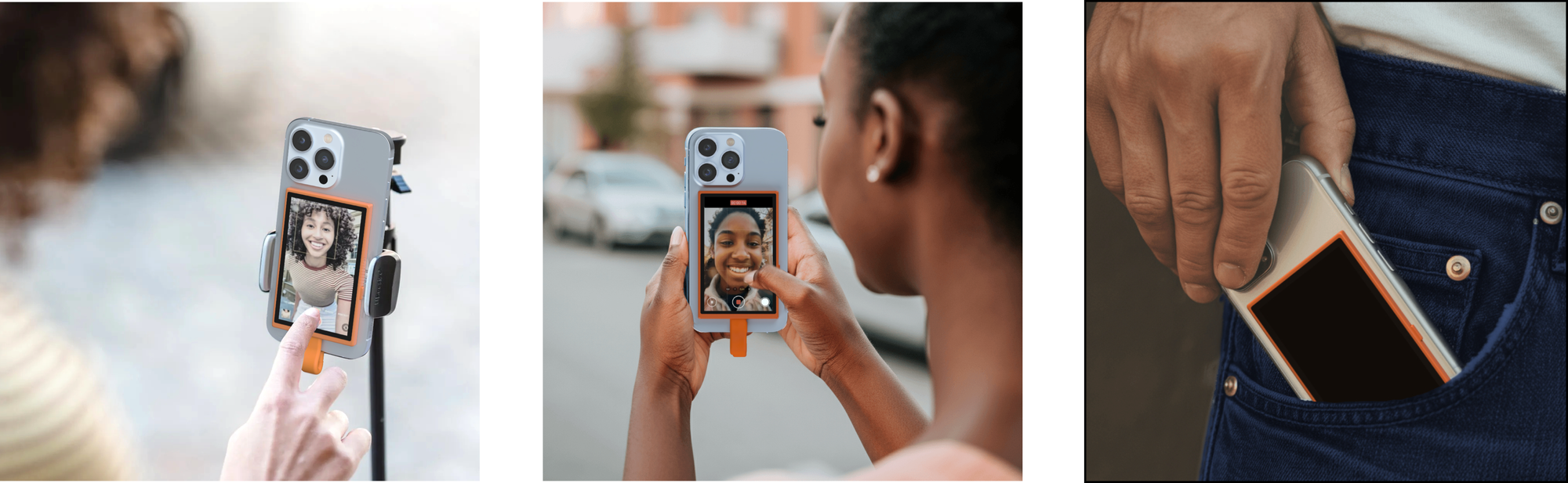 Storymate is a compact hardware screen that magnetically snaps on the back of your iPhone. It acts as a rear-facing viewfinder, showing a miniaturized version of your screen into a physical display, letting creators see what they were filming in real-time. No need to charge it, just plug it using USB-C and you're good to go.